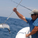I learned to catch bait with a gill net more than 20 years ago at Hatteras, and it has served me well. I had some excellent teachers: charter captains Rom Whitaker, Bruce Armstrong, Steve “Creature” Coulter and Spurgeon Stowe. When the bait gets scarce at Hatteras, these captains ease along the beach, watching their fishfinders over places known to hold bait. Once they see the marks indicating bait, they drop a sink net on them. The bait isn’t circled, but the net is set across the marks on the fishfinder.