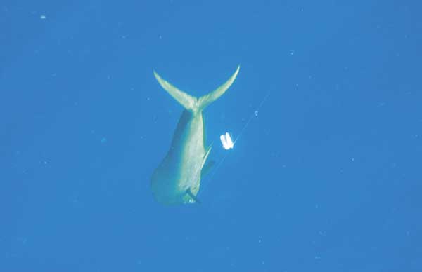 “Dolphins tend to run in the upper water column,” he said. “I like to keep my baits and lures skittering on the surface. I prefer artificial lures or natural baits rigged with colored skirts. My preference as a bait is ballyhoo, but other natural baits such as mullet will work fine in conjunction with lures or skirts. I seldom use naked ballyhoo as bait. When trolling, I keep my boat speed at around five to seven knots.”