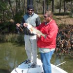 “Don’t let that one get all the way to the bank,” Jernigan said as one fish turned toward shore. “There is an oyster rock up there, and he might nick the line or leader and break it. Hold your rod tip high to keep the line up in the water and see if you can turn him.”