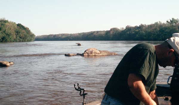 The big blues get ready to spawn by the first of May and move upstream, but the shallow water and numerous rocky shoals block their movement. These catfish have little choice but to house up in deep pools below the rocky shoals, moving from pool to pool whenever the release of water from Blewett Falls dam causes the water to rise to about 5 feet.