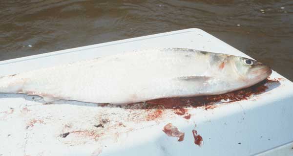 Burr uses 15- to 18-inch American shad and cuts them into three large chunks.