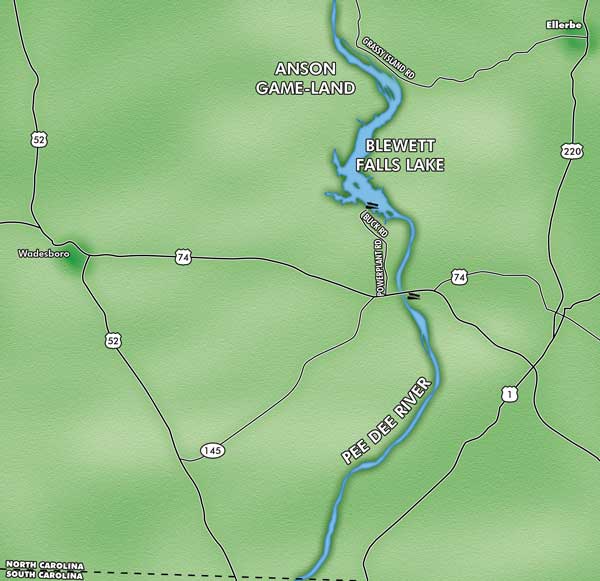 This watery paradise, teeming with blue catfish weighing as much as 70 pounds and the average catfish weighing 30 pounds, consists of a 25-mile stretch of the Pee Dee River between the U.S. Highway 74 bridge near Wadesboro and the North Carolina-South Carolina border.