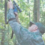 The hogs were on the move, and Hardwick sensed they were getting nervous. As he stalked, they quickened their pace, but he closed the distance, and his laser rangefinder indicated 41 yards to the closest hog. Hardwick leaned back against a tree and braced his arms across his knees in a classic shooting position.