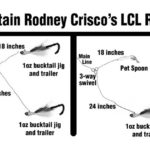 At the tag end of the line, Crisco attaches a 50-foot section of 20-pound mono or fluorocarbon leader with a double uni-knot. To the other end of the leader, Crisco ties a 3-way swivel with either a double-bucktail rig, a bucktail and spoon or a combination that includes hard stick baits.