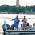 Rodney Crisco (front) and Mike Lundy are two veteran striper fishermen who believe in deep-trolling during the hottest months of the summer, searching for fish in the narrow bands of water that match tolerable temperature levels with desired dissolved-oxygen levels.