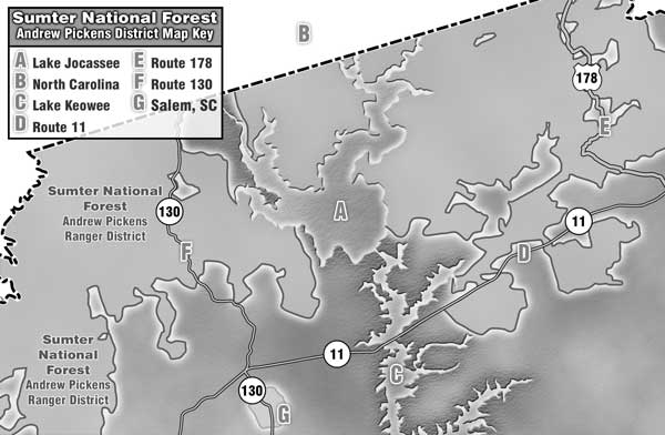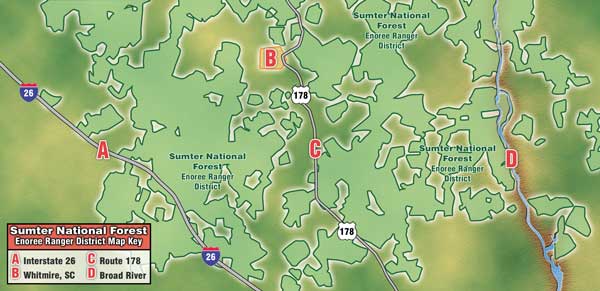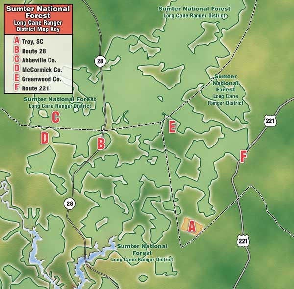The largest national-forest tracts are in three districts: the Andrew Pickens Ranger district in the northernmost part of Oconee and Pickens counties in Game Zone 1; the Long Cane Ranger district near the borders of Abbeville, Greenwood and McCormick counties; and the Enoree Ranger district, primarily north of Newberry.