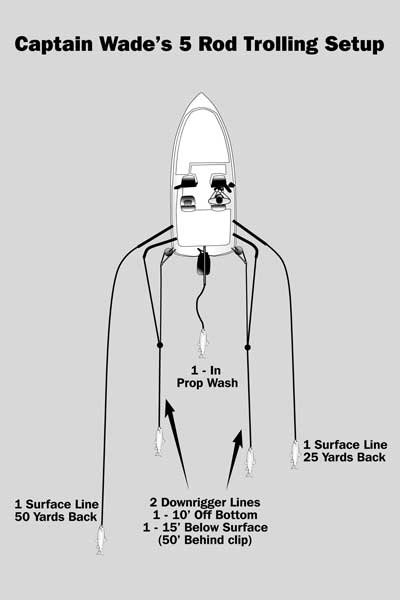 Long slow-trolls at 1½ miles per hour, pulling five live-bait rigs and covering all of the water column. He has a bait 50 yards behind the stern of his boat at the surface, one 25 yards from the stern at the surface, one in the prop wash, and two on downriggers at different depths. He clips the lines 50 feet behind the downrigger balls and places one bait 10 to 15 feet above the bottom and another 10 to 15 feet below the surface.