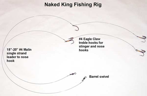 Rourk said finding fish is much more important than exactly what baits you use or how you rig them, because kings that are feeding will strike almost anything that resembles a baitfish. Live bait will work, but he prefers frozen cigar minnows or hard baits. The frozen cigar minnows and hard lures — drone spoons and cedar plugs — are pulled at around six knots, so Rourk can cover a broader area.