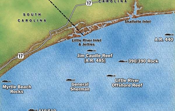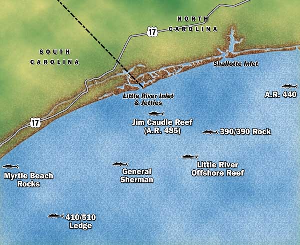 Little River Inlet and the surrounding waters along the South Carolina-North Carolina border are well known for their fall king mackerel run. Prime artificial reefs, wrecks and livebottom areas pepper the ocean floor within a few miles of the Little River jetties, attracting and holding million of the tasty baitfish. So Little River is ideal for the small-craft angler, providing the reel-screaming addicts with a quick way to prime fall fishing for kings.