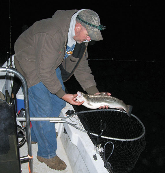 “I’ll put out six lines and bait each one with live minnows, frozen cut herring, or whole nightcrawlers,” he said. “Trout are not particularly line-shy at night, so I fish light to medium tackle with 10-pound test (line). The bait is hooked on a 1/0 Eagle Claw gold Aberdeen hook. The amount of weight used depends on when and how much current is being generated. I begin with a half-ounce before the pumping starts and then change over to a 1-ounce egg sinker.’