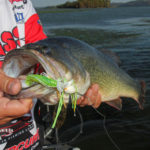 He’ll also search with a Mann’s Hardnose lizard (green pumpkin with chartreuse tail or watermelon red) on a Carolina rig comprising a ¾-ounce teardrop lead weight and a 5/0 Gamakatsu wide-gap hook.