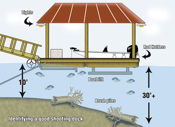 For those unfamiliar with the tactic, shooting docks is a single-pole tactic for skipping a crappie jig into the furthest recesses under a boat dock, a piece of structure that crappie frequently use as a place to hide, ambush prey, or just hang out.