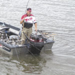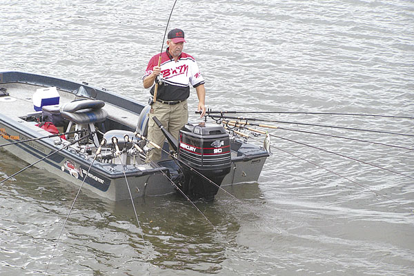 McClellan trolls from a 17-foot Ranger 681 boat he has outfitted with an array of Driftmaster trolling bars and rod holders that allow him to space his rods across the transom. He uses rods between nine and 16 feet long, spacing from short to long the closer the rod holders are to the gunwales. The result is a barrage of 12 rods with different baits as he uses his Minn Kota 55 Auto Pilot trolling motor to steer and propel his boat along his trolling run.
