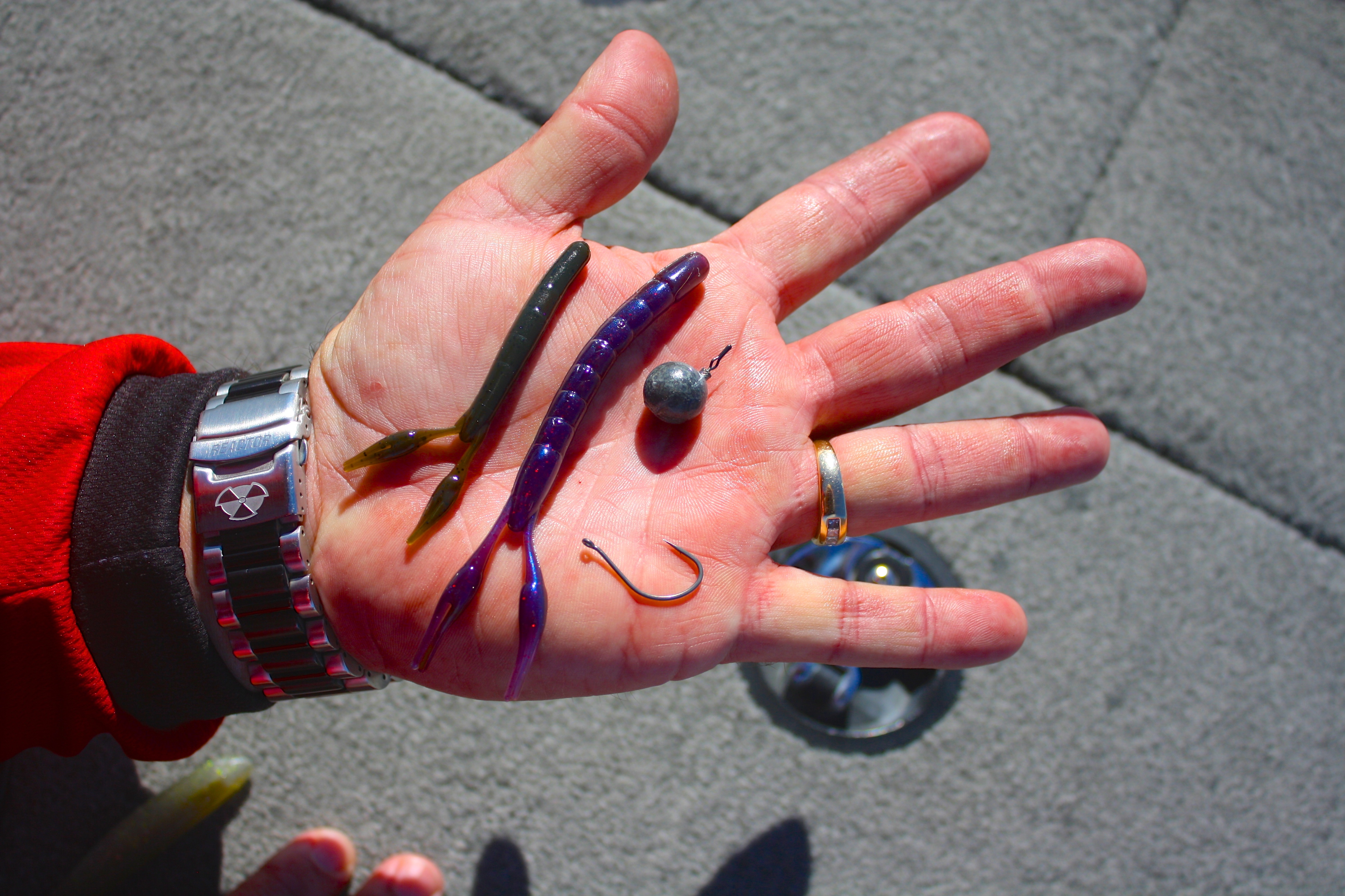 For baits, Grein prefers the Missile Fuse 4.4 and the Missile Drop Craw. The Fuse is a slender, 4.4-inch straight worm with crawfish claws at its end, while the Drop Craw is a 3-inch crawfish-shaped worm specifically designed for drop-shot fishing that can be nose-hooked or Texas-rigged. He chooses the baits in green pumpkin and purple.