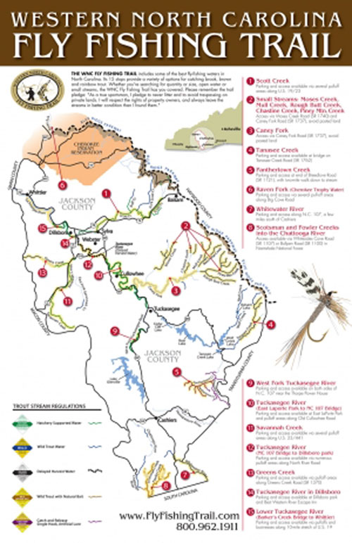 MAPS: Jackson County Tourism, 800-962-1911 or www.flyfishingtrail.com; N.C. Wildlife Resources Commission, www.ncwildlife.org/Fishing/TroutFishingMaps.aspx