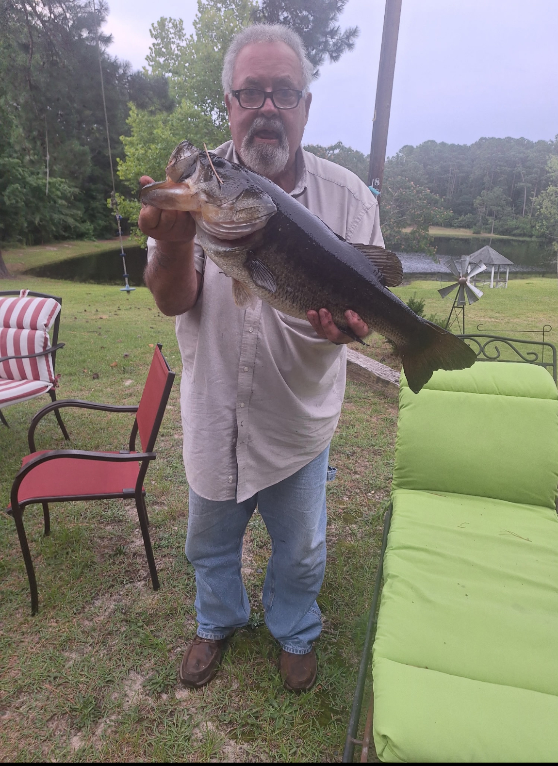 Buddy Edwards caught this 10-pound bass on July 8th with a rubber worm at a private pond in Rockingham, NC. At age 75, he is a lifelong fisherman and loves having his children and grandchildren over to fish in his backyard.