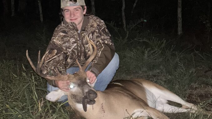 15 year old Brayden Ginn 192# 8 point killed on the family farm in Furman SC, 80 yards behind his house in his stand. The family has been getting pictures of this buck for three years and no one has never laid eyes on him till that day, we called him the crab claw buck. He came out in the corner of the field just a few feet chasing doe and ran her straight back in the woods. He did this twice, on the third time he stopped long enough for Brayden to get his cross hairs on his neck. His daddy taught him how to shoot so if he only had a head shot he was gonna take it and feel comfortable doing it.