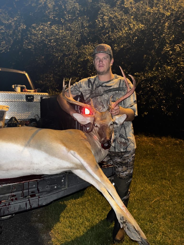Daniel Epps killed this 194-pound, 7-point buck while hunting from a tripod in a hay field in Bamberg County, SC. He shot the buck, which had an 18-inch wide spread, at 8:04 p.m. on Aug. 18, 2023.