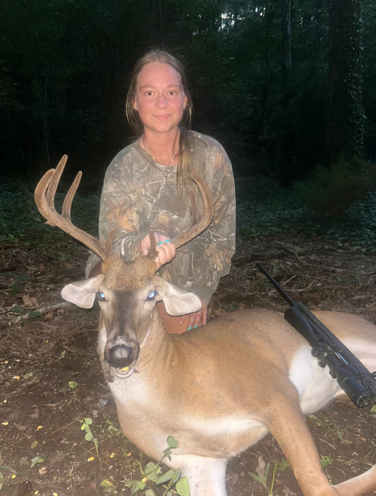 My daughter Caleigh killed this nice 8-point buck in full velvet on my first solo hunting trip in Lexington, SC. #backyardbuck