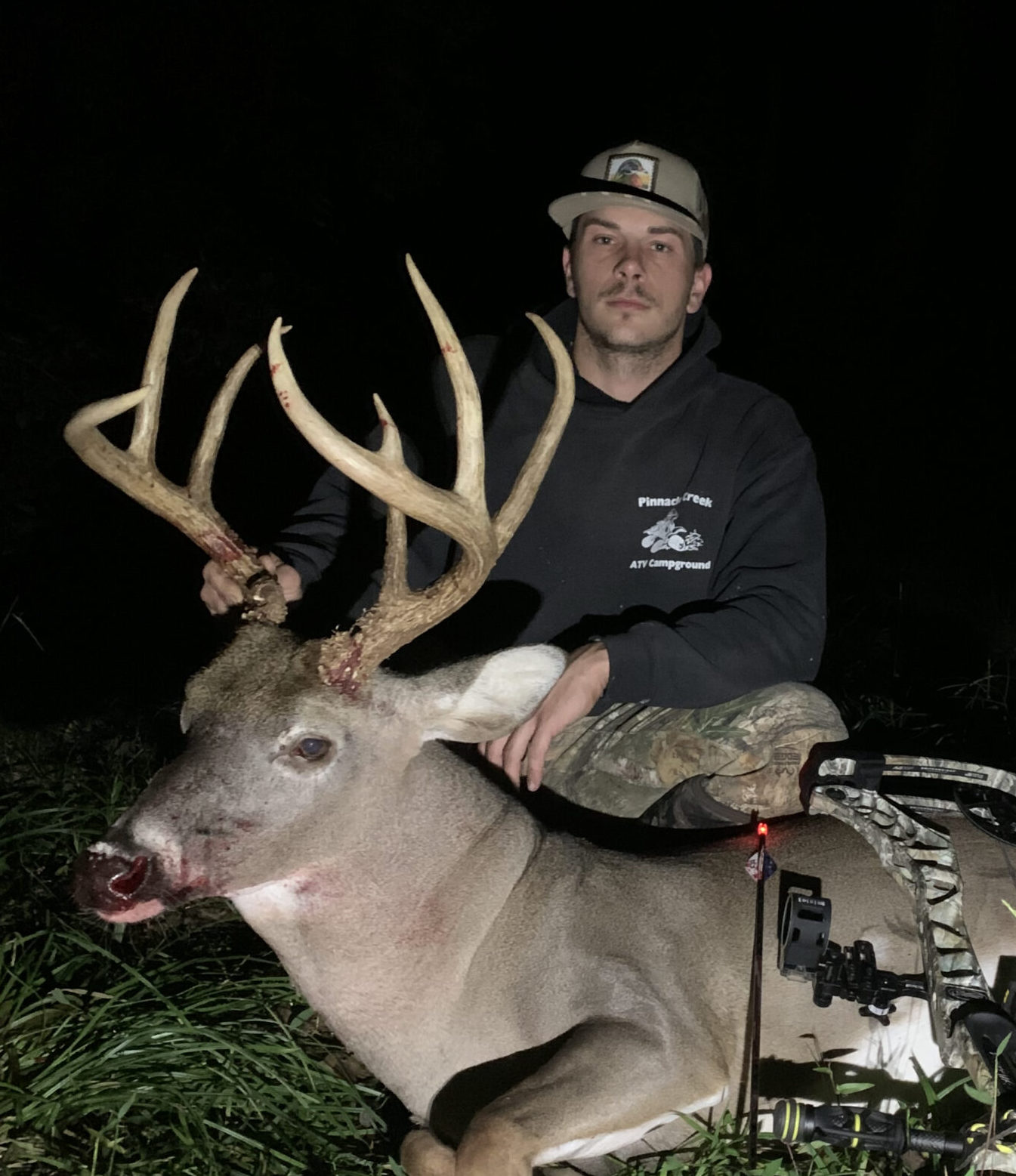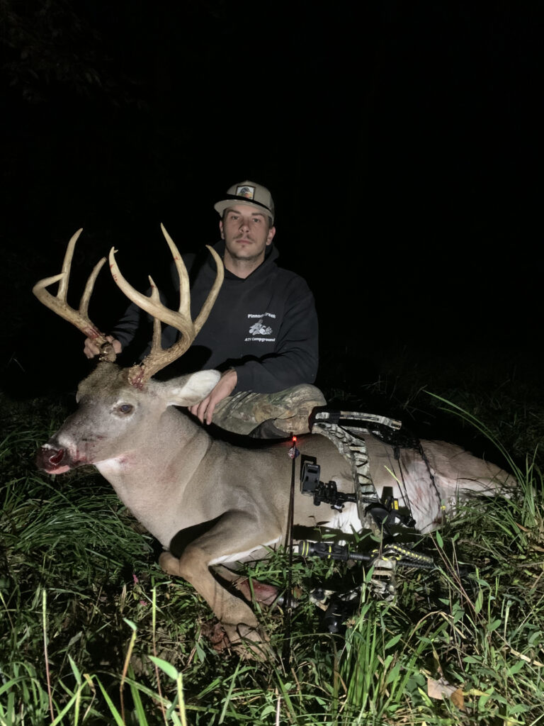 “A passion is an understatement some days chasing these guys around. Constantly thinking about what they’re doing and the amount of time and money truly invested in these deer. This deer showed up during daylight at 2 p.m. the day before, and I knew I better get in there the next evening after work. At 6:40 a.m., he came cruising through the woods and I lost sight of him in the thicket. A couple of minutes later, I look down, and at 22 yards he was standing there. Sent the Rage and it was all big smiles from there. thank the Lord.”