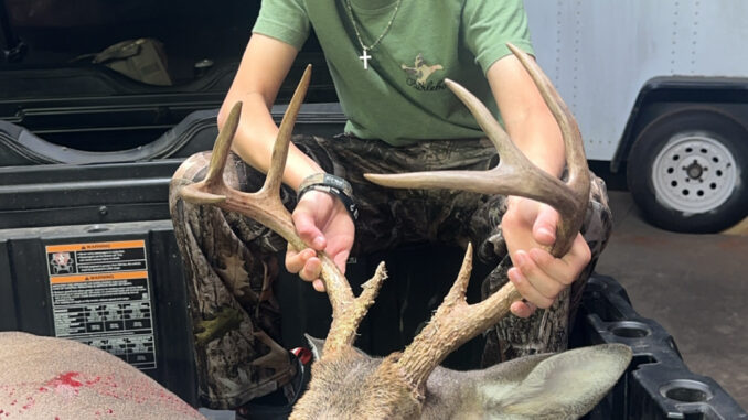 Mason had watching this deer on camera for a couple of weeks leading up to the Game Zone 2 Youth Day on his aunt’s farm. With shooting light fading the deer came out about 100 yards away a few minutes before dark. Once he gave Mason a broadside shot that’s all it took for him to drop him in the corn with his 6.5 creedmoor.