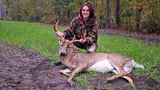 A friend of ours invited my husband and I to come hunt on his family property. I really enjoyed the hunt, we had a few deer come out for quite sometime and we just watched them. This beautiful buck stepped out and it was game on. I used a 308 and it was about a 100 yard shot. And now my husband can’t call me the 6pt queen anymore!