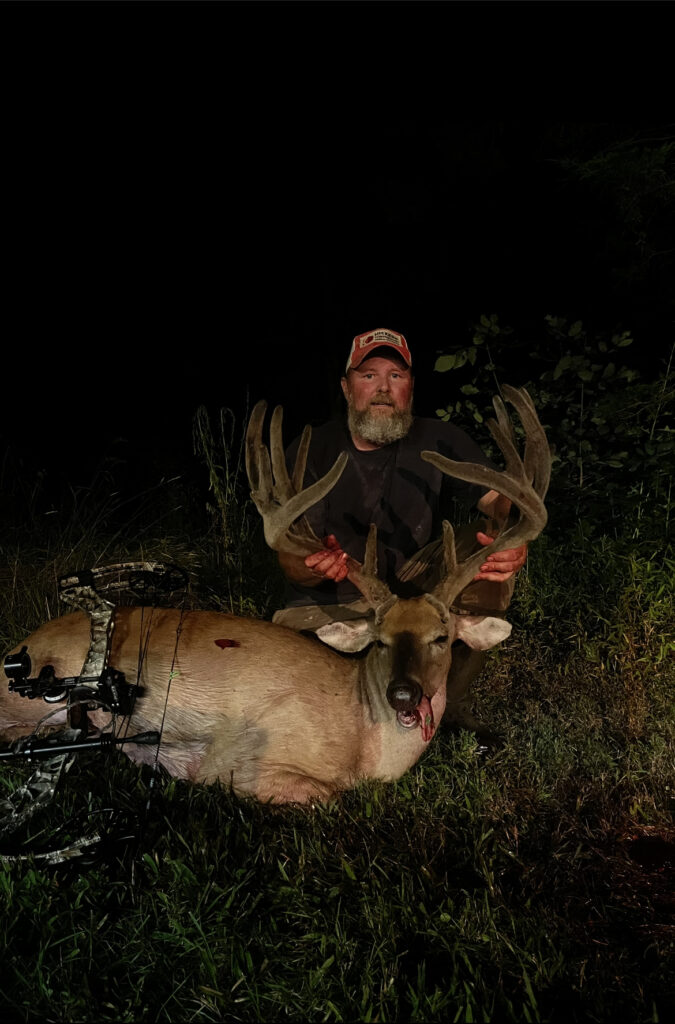 At first, I thought the shot was a little high. But after checking my arrow and seeing the blood trail, I felt better about it. After walking back to my truck to get my light, about 30 minutes passed, and I went straight to tracking and found him about 100 to 120 yards from shot.