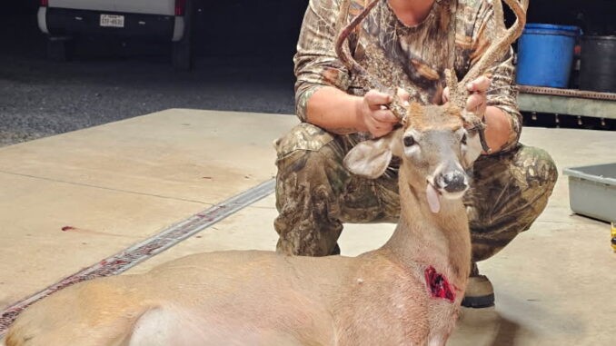 From 20 yards, I took the shot with my Barnett Whitetail STR and a Rage Hypodermic broadhead. The buck was quartering toward me and jumped the string, turning the shot into a neck hit that severed the jugular. He ran less than 20 yards and went down quickly.
