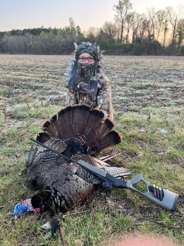 We arrived at the field just before 6 a.m. on April 5 for our hunt in Beaufort County, NC just north of the beautiful Pamlico River. It took us about 20 minutes to find our spot and get set up. Baylor was positioned with his back against a little sweet gum tree facing one jake and hen decoy set up on the field ridge at about 25 yards.