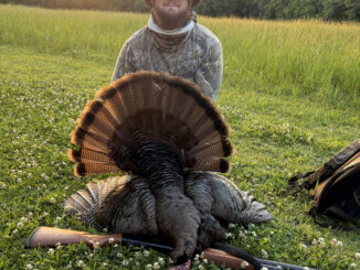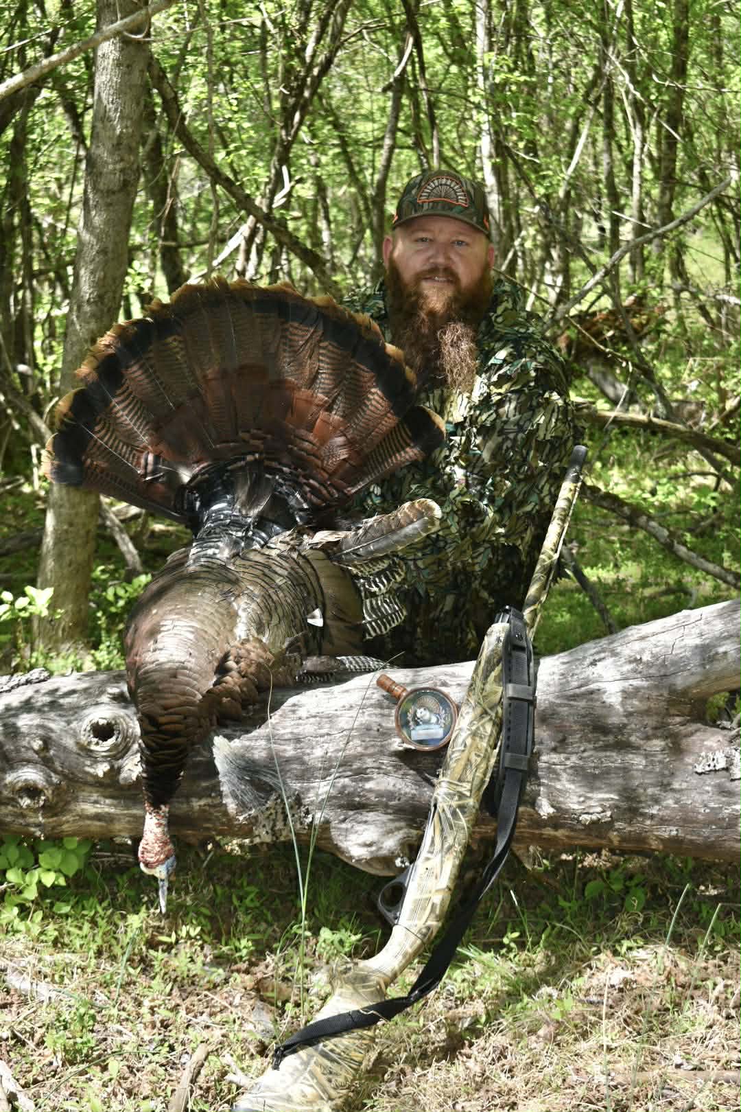 Wyatt and his dad set up on the turkey before daylight. With a few soft calls and scratching of leaves the turkey pitched down within gun range and strutted to 25 yards for Wyatt to