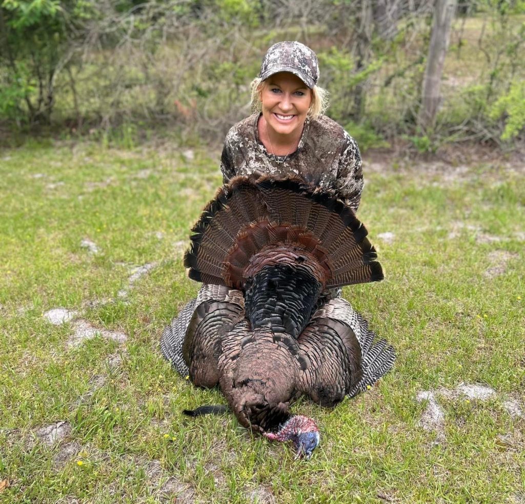 Marti Schutte has bagged a few birds in the past 9 years, always with the guidance of her husband. During that time, she’s tried hunting by herself, but things didn’t work out for her on those trips. That all changed on Sunday, April 16, 2023, when she bagged her first solo bird. The gobbler weighed 19 pounds, had a 9-inch beard, and sported 7/8-inch spurs.