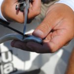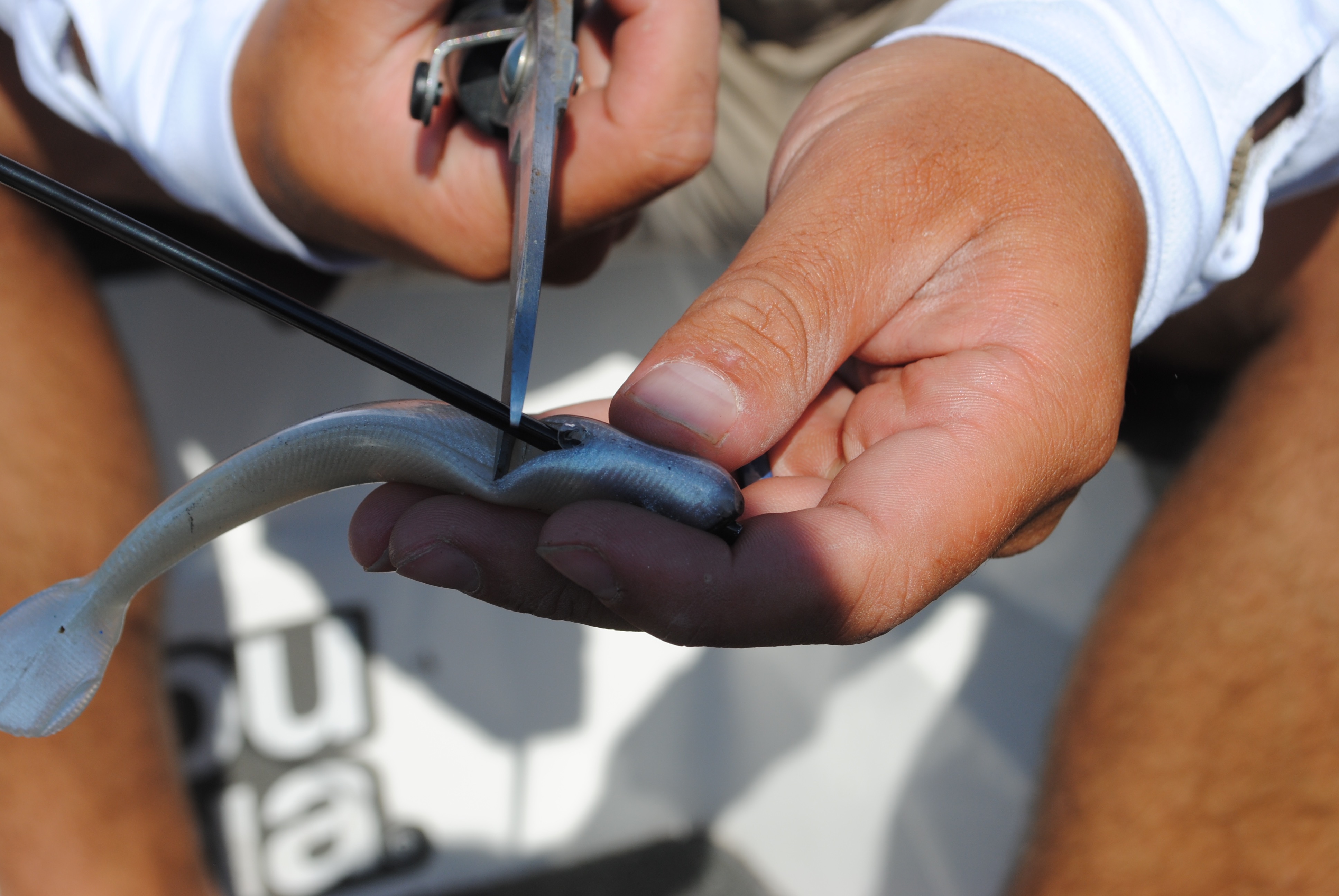 Fulk takes a hollow, plastic coffee stirrer and pushes it up through the bait’s belly and out its nose, then clips off the exposed ends. Next, he runs the line through the straw from nose to belly and threads a standard bullet-shaped worm weight on — backwards.