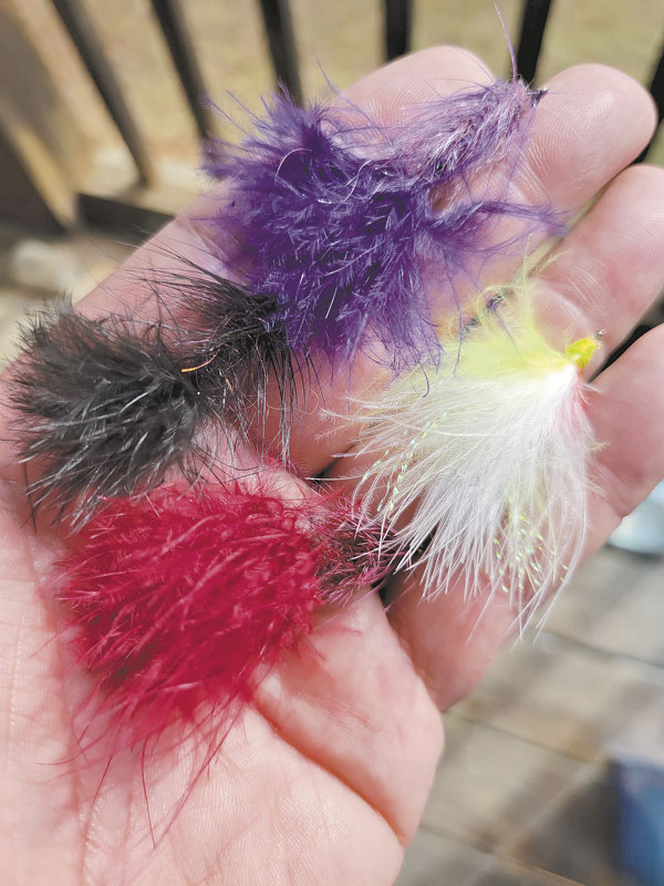 Another good fly is a Zonker in colors white or black and in the same sizes. A marabou streamer in white, or white and chartreuse, in the same sizes also. This color combination is especially good if the water is a little dingy. Slightly weighted versions are best.