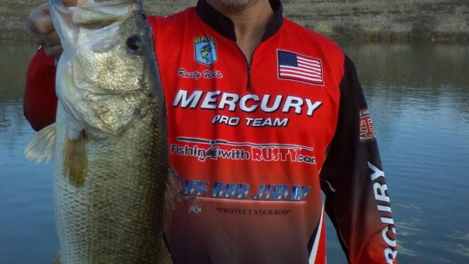 Guide Rusty White of Rock Hill, S.C., is catching lots of quality bass right now, and he’s getting it done in very shallow water.