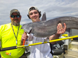 “This is the ideal time to catch a super-sized cat in skinny water,” he said. “When you hook a 30- to 40-pound fish in that depth, they’re going to do some serious surface-wallowing because they’ve got nowhere else to go. And it’s a great opportunity to catch really big catfish.”