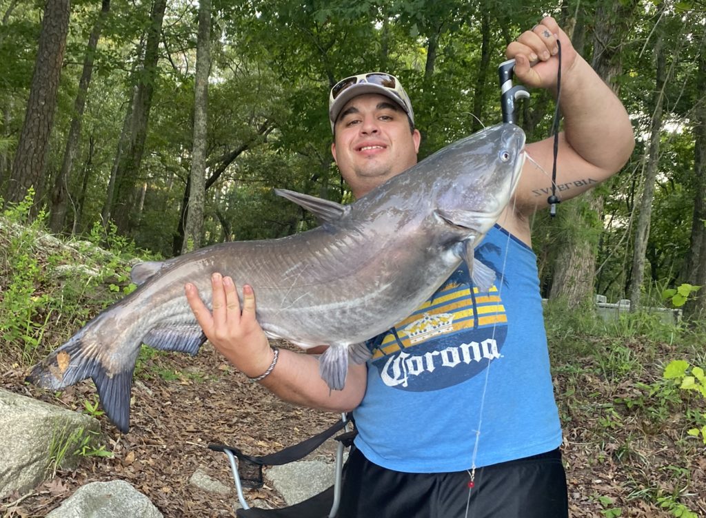 I caught this blue cat off the bank using shrimp for bait on May 18, 2022. It was 40+ pounds and put up a great fight. Big thanks to my wife who did a great job helping land it without a net.