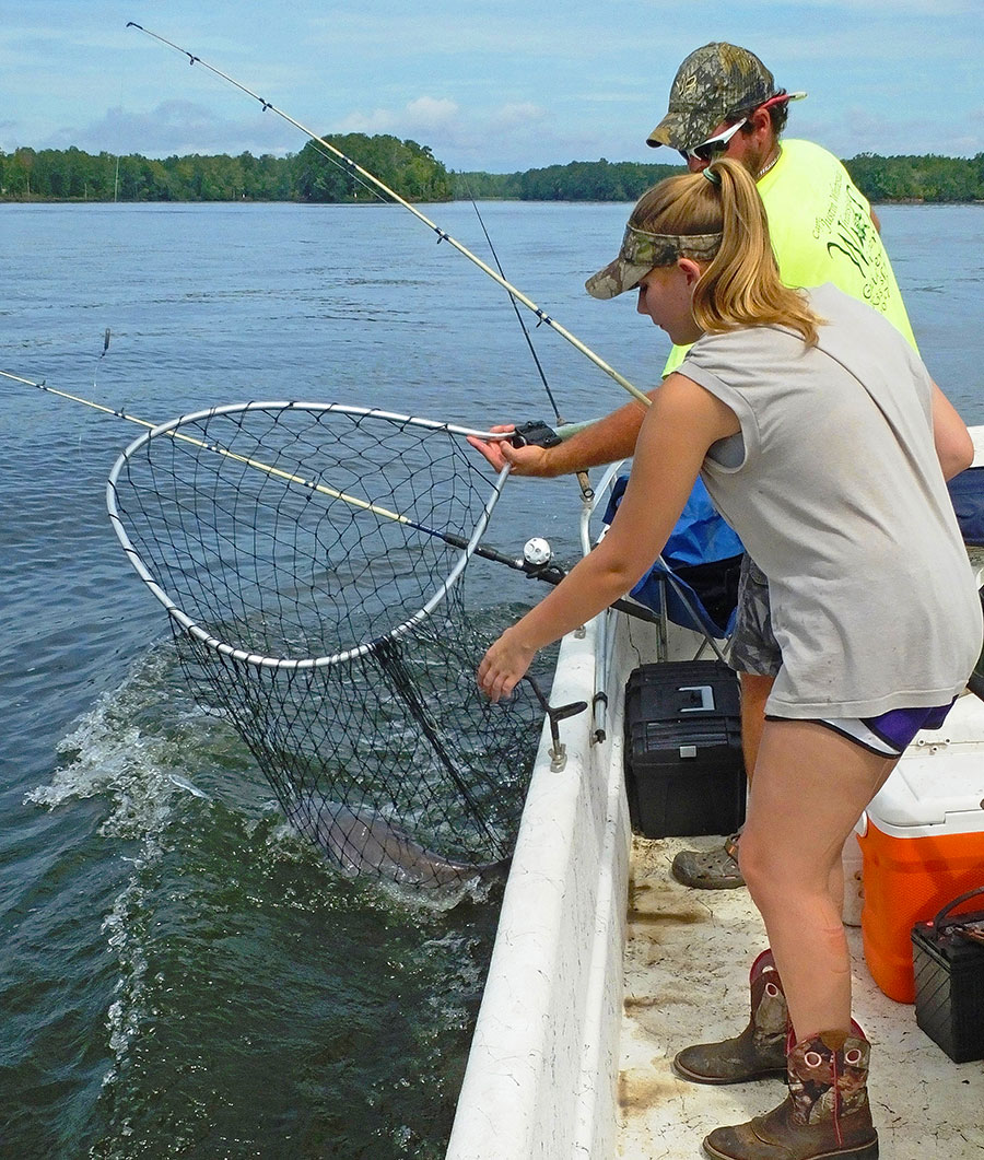 Whiteside (803-417-0070) said clients will often hook big blue catfish in water less than 10 feet deep, even in mid-day. Until he locks in on a solid pattern for the day, he’ll cast rigs into multiple depths form his anchored setup. When forage is scattered, he will drift-fish the humps and ledges.