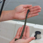 First to be splashed was a traditional setup known as a Santee rig or Carolina driftmaster rig, the most-familiar to catfishermen slow-trolling cut baits. To the 30-pound running line, he tied a three-way swivel, one ring getting a 21/2-ounce slinky weight tied on with a foot of 15-pound monofilament, and the other getting a 2-foot leader of 60-pound mono tied to a 9/0 circle hook with a 3-inch cigar float pegged between the swivel and hook.
