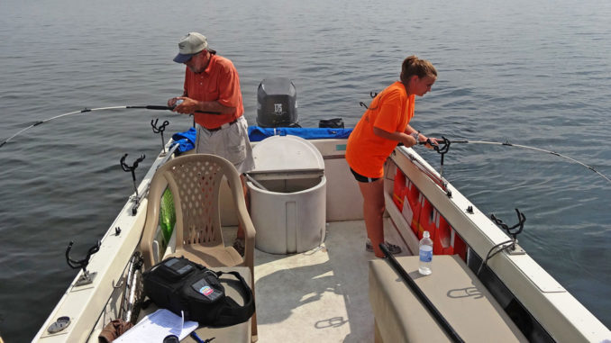 “The fish are deep and not surface-feeding but our frenzied activity reaches the pace of a being in a big school of topwater fish. The longest wait is usually when you drop the bait down to the right depth. Someday, we’ll go out during mid-day with 5- or 6-dozen baits and be back in within two or three hours and have no bait and be arm weary.”