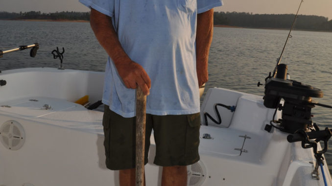 Sometimes, tapping on the hull attracts stripers and hybrids to the baits below. The trick is to develop a tapping rhythm that the fish like, which is usually a constant tapping. Imagine an old steam engine such as the one that powered the “African Queen” in the old Humphrey Bogart movie, and you have the right idea.