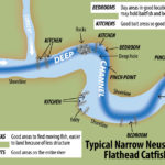 The best flathead catfish fishing locations are in close proximity to one another, such as flats — aka “kitchens” — undercut banks, eddies, pinch points where small creeks enter the main river and rocky areas and near trees overhanging undercut banks.