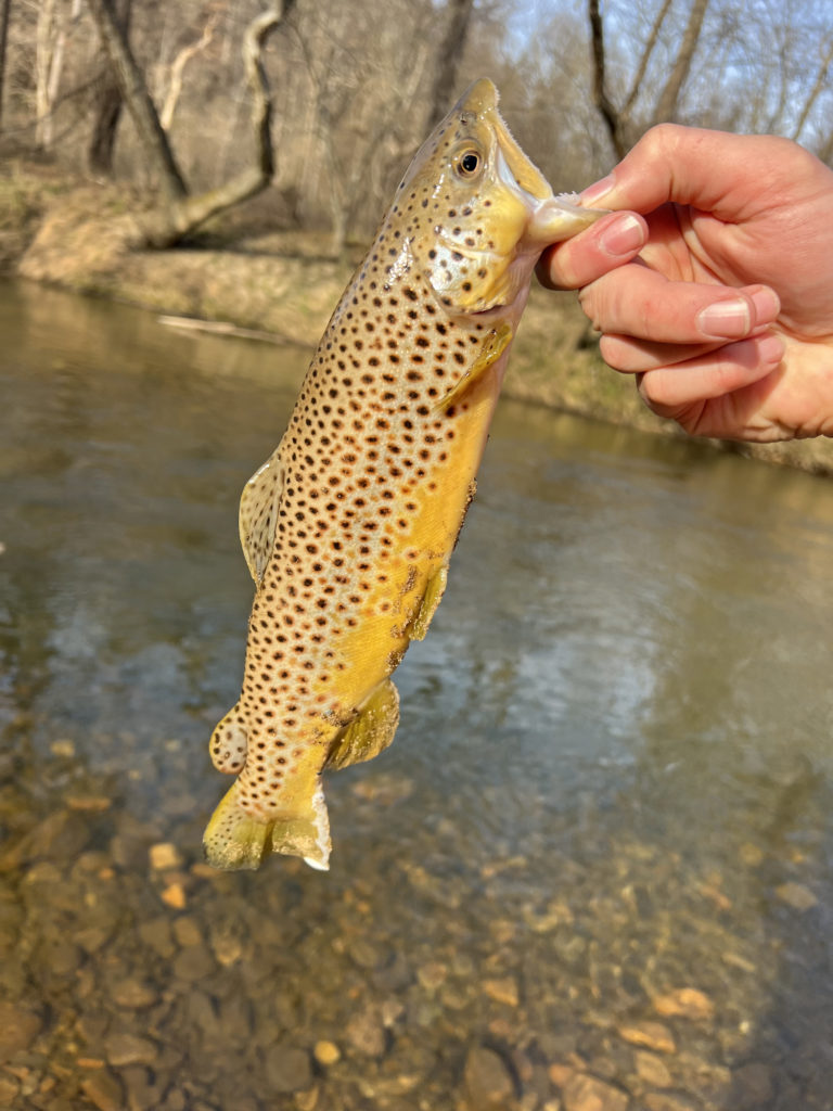 Caught the prettiest brown trout of my life in Marion, NC on the greenway. It was caught on my TFO fly rod on a purple zebra midge.