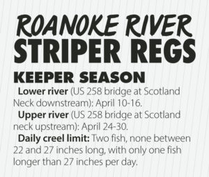 WHEN TO GO — Stripers are present in the upper Roanoke River from mid-April through mid-May and sometimes into late May. Keeper season in the upper portion of the river, from the US 258 bridge at Scotland Neck to Roanoke Rapids Dam is April 24-30. Keeper season downstream from the US 258 bridge is April 10-16.
