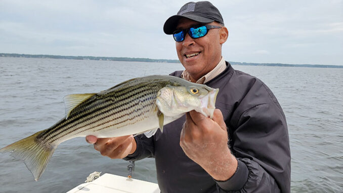 “When the stripers are hitting the surface, then suddenly stop, they’re going back down. That’s a good time to let the fluke sink before reeling,” he said. “You’ll catch a lot of stripers with that method right now,” he said.