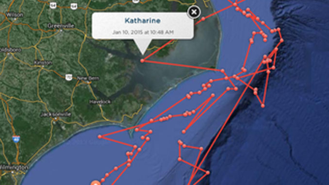 After spending Saturday at Diamond Shoals, Katharine headed farther south, popping up to surface multiple times through Jan. 12 off Core Banks and Cape Lookout National Seashore. She later was detected off Wilmington.