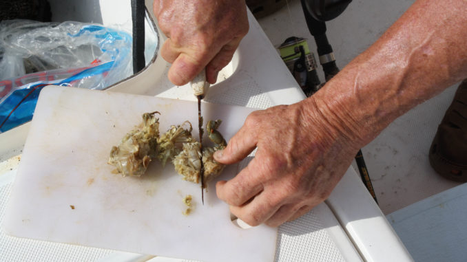 Guide Dan Utley considers a chunk of a legal blue crab an ideal bait for fishing under a cork in high-water grass.