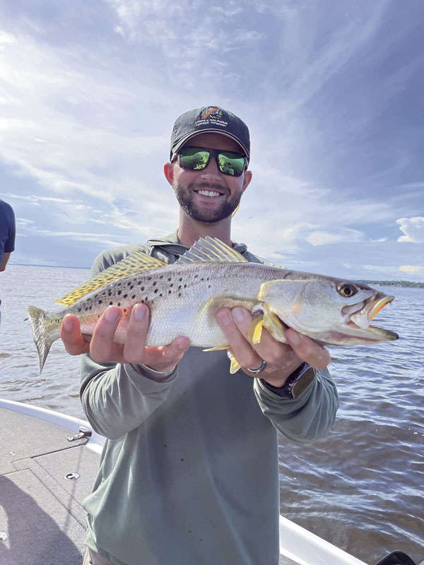 “These trout love shrimp, little croakers – any little bait they can find,” he said. “The brown shrimp are just showing up in June. The trout like deep points – points that are shallow on one side and drop on one side. In little bays, they like water that’s a little deeper because the water is starting to heat up and they’re moving out to spawn.