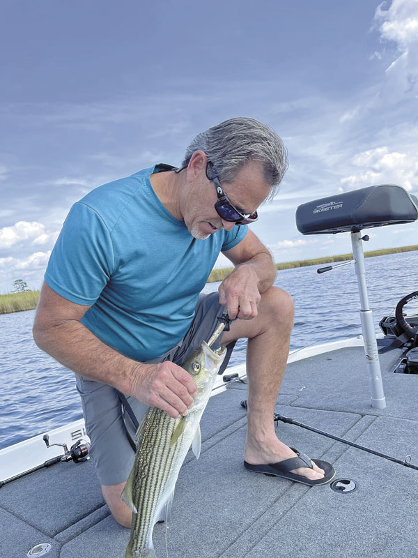 Once in a great while, Stewart said, you’ll run into a big, hefty rockfish that missed the spawning train up the rivers in April and May. Mostly, he said, “These fish are spawned out, skinny fish. They almost look fragile. They come down the river hungry. You can tell they’re spawned out. If you catch one, get it back in the water quickly.”