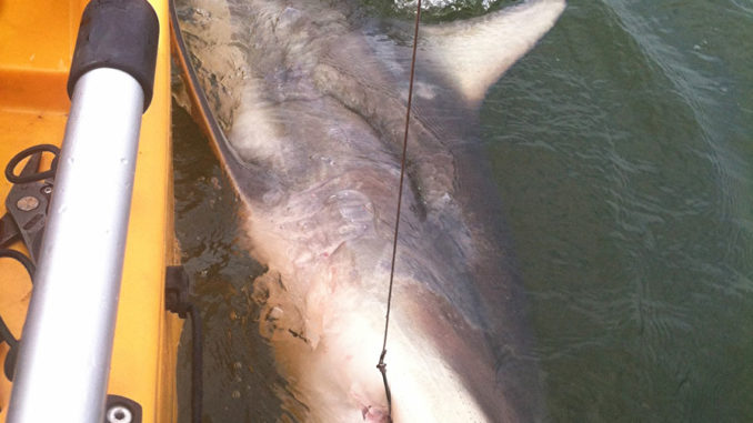 Brad Knight has a pretty standard setup for rigging for sharks when fishing from his kayak. It works, and it’s strong — strong enough that he boated a 140-pound class tarpon three years ago while fishing for sharks.