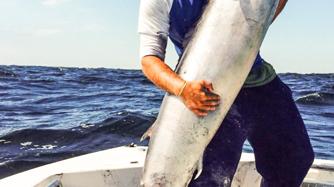 After stopping to net a morning’s supply of fresh pogies outside of Carolina Beach Inlet, Balbino set sail with his 6-man crew to a king mackerel hotspot. Resting 10 miles offshore, the 10-Mile Boxcars is an artificial reef submerged in 60 feet of water and comprised of 10 railroad boxcars plus chunks of concrete.